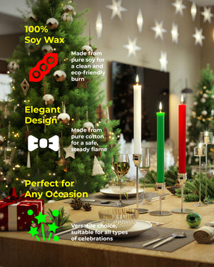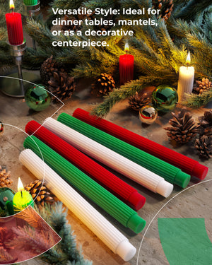 - Festive Elegance: Brighten your holiday decor with this set of 6 taper candles Christmas in classic x2 green, x2 white, and x2 red, perfect for adding a festive touch to any celebration.